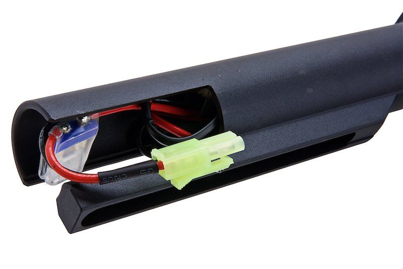 Battery: 7.4V Small LiPo Type recommended (Battery not included. Wired to buffer tube with Deans connector)