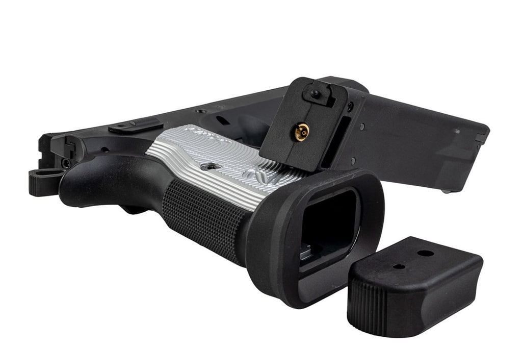 - Rear sight can be replaced with a Shadow 2 optics plate to install a red dot