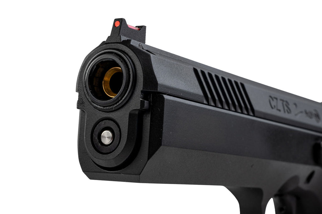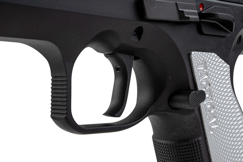 The KJ Works CZ TS2 GBB Airsoft Pistol is a premium gas blowback pistol crafted for competitive airsoft players and enthusiasts. Officially licensed by ASG, it replicates the renowned CZ TS2 Tactical Sport handgun with exceptional realism and performance. This pistol features a full metal frame and slide for durability and a realistic weight. With an overall length of 230mm and hefty weight of 1.4 kg, it offers a balanced and solid feel. Its lower slide profile design provides a stereo-typical CZ low bore axis aesthetic, intending to reduce the vertical recoil performance. The 120mm inner barrel ensures precision, while the adjustable hop-up system enhances accuracy. Equipped with a 26-round green gas magazine, it delivers a consistent shooting performance.