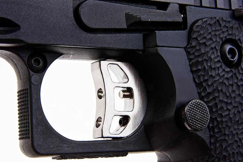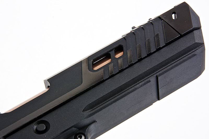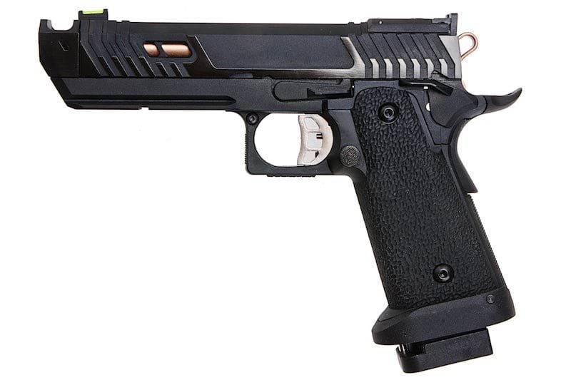 With a built-in static fiber optic front sight, single port compensator, ghost profile rear sight, adjustable competition trigger, and seamlessly blended grip safety, it delivers reliability, accuracy and ergonomics like no other. This full metal Airsoft GBB pistol also features a Copper finished hammer and barrel, with a beautifully crafted two tone ergonomic ported slide featuring aggressive serrations. This, is the ultimate handgun you've been saving up for!