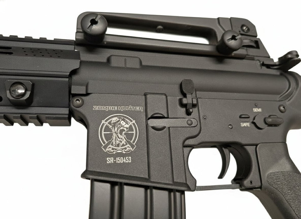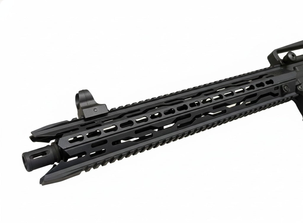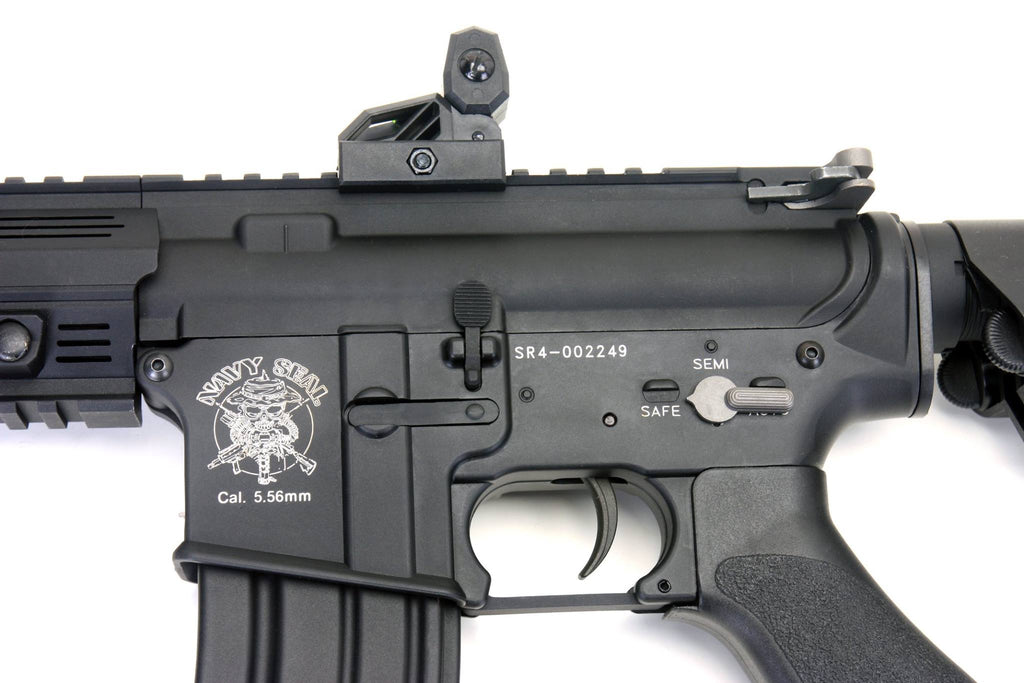 - Other metal parts: Trigger, selector, ejection port cover, trigger guard, magazine, front/rear sling mounts, forward assist knob, steel motor pinion gear, locking body pins, rail system