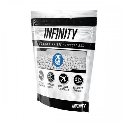 The Infinity 0.25g biodegradable airsoft BBs are precision 6mm BIO BBs from Taiwan that are highly polished and seamless BBs for 6mm airsoft rifles and airsoft pistols. Their ball bearing quality precision gives the flight path greater accuracy and consistency. Our BIO BBs are made from PLA (Polyactic Acid), which is recyclable and compostable thermoplastic derived from a renewable, earth friendly resource, such as corn starch. The Infinity airsoft BIO BBs are packaged in a 1 kilogram resealable bags. We recommend our Valken M4 Magazine Style BB Speed Loader for use with Infinity BBs when loading mid-cap magazines.